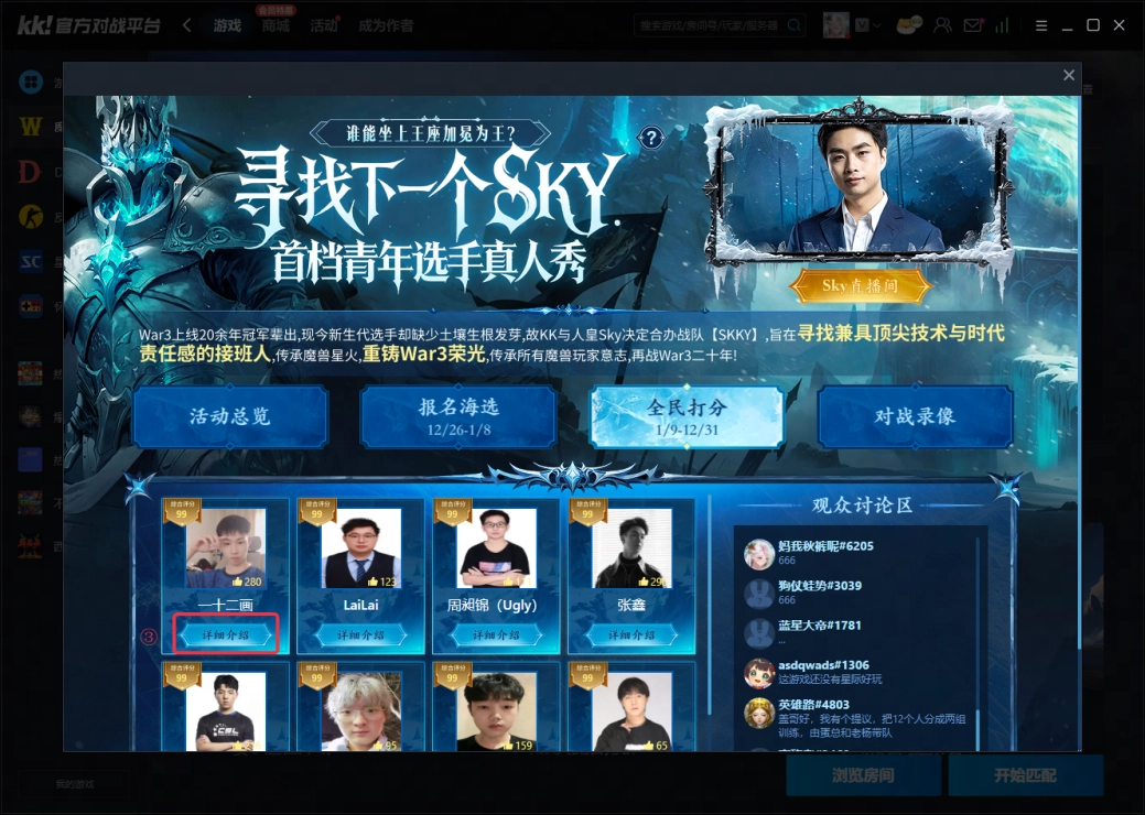 KK官方对战平台《寻找下一个sky》选拔活动启动后,经过多轮考核脱颖而出的12强选手接受了采访。每位选手都有独特的风格与故事,在这款玩家群体渐趋成熟的经典游戏中,他们如同穿透迷雾的光,为魔兽争霸注入了充满活力的年轻气息与新的可能。