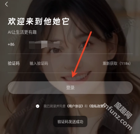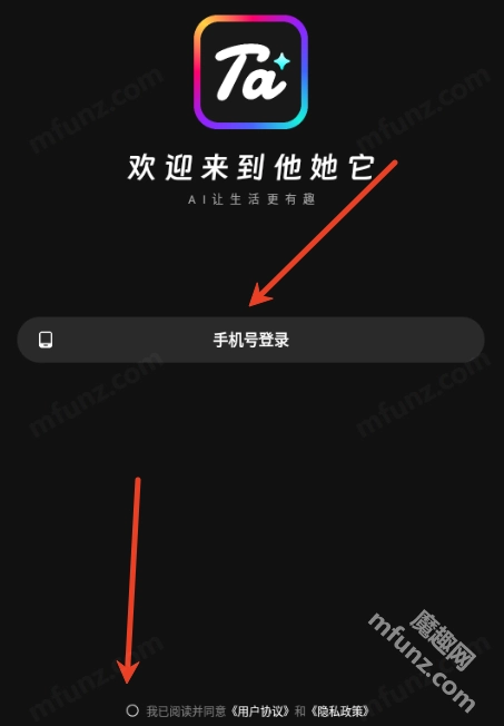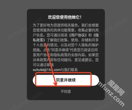 打开他她它阅读协议,点击同意并继续