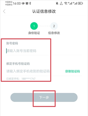 修改认证信息时,要准确填写账号当前密码和收到的短信验证码,信息填写正确后点击“下一步”。