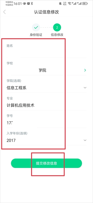 最后,把正确的学校名称、学号等认证信息补充完整,在确认信息准确无误后,点击“提交修改信息”按钮,这样就能完成绑定学校的更换操作了。