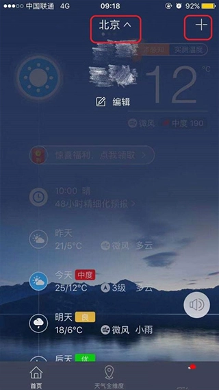 进入主界面后,界面上方标注着“北京”的区域会呈现当地的天气状况。