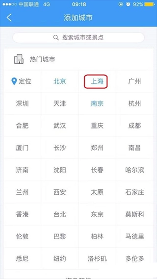例如小编想了解上海的天气情况,在“添加城市”界面选中上海就可以了。
