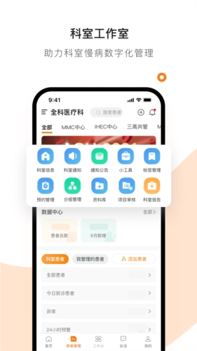 数据中心能直观呈现科室的患者总数、新增患者数、预警患者数等运营数据,助力科主任与医生合理安排工作。