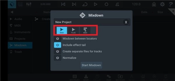 然后点击左上角,在mixdown中选择最上方的create mixdown选项。