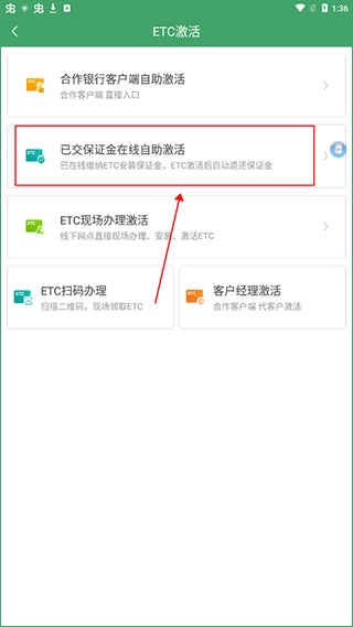 进入“ETC激活”界面后,共有五种激活途径可供选择,分别为“合作银行客户端自助激活”“已交保证金在线自助激活”“ETC现场办理激活”“ETC扫码办理”以及“客户经理激活”。考虑到除“已交保证金在线自助激活”外,其余方式都可由银行工作人员协助操作,因此小编选择了这一自助激活方式。
