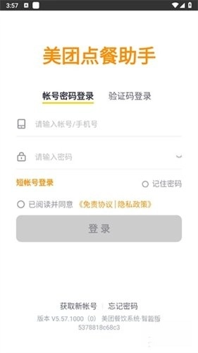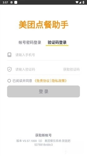 首先启动美团点餐助手,进入软件后,可选择账号密码登录或验证码登录这两种方式。