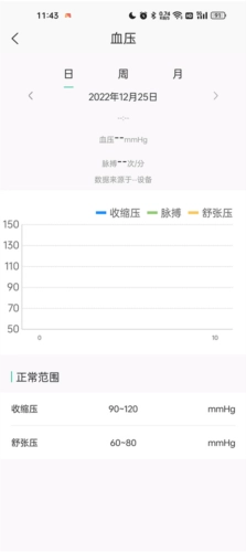 将血压的波动情况以图表形式呈现给用户参考,分别展示收缩压、脉搏和舒张压三种数据类型,同时在图表下方标注对应的参考范围,方便用户随时查看自身的实时身体状况。