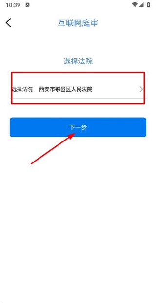 在互联网庭审页面选定法院后,点击“下一步”按钮,即可进入验证码登录界面。