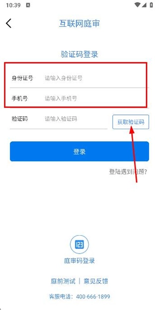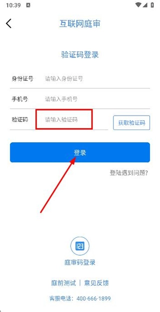 在验证码登录界面输入验证码后,点击登录按钮即可完成互联网庭审的登录流程。