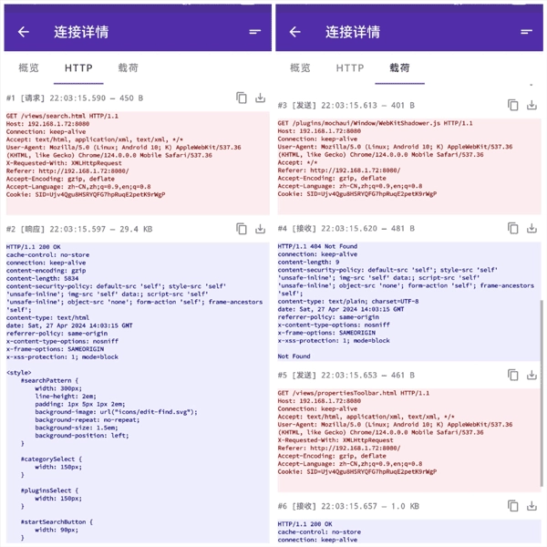 左图借助搜索框筛选特定目标主机,能看到这些连接当前处于关闭状态(CLOSED),这是由于采用的是短连接场景;随意选中一个连接即可查看概览信息,涵盖连接持续时长、访问的URL、协议、进程与进程ID,还有产生的流量规模以及载荷长度。