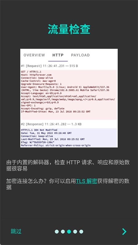 PCAPdroid软件之中你可以非常轻松的将各种不同的数据包在三/五次握手的期间给他截取下来,获取数据包之中的内容,为移动网络提供全链路的透明化监控能力。