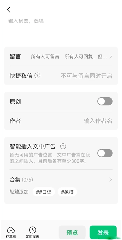 添加封面、标题、摘要、设置广告、原创声明、作者、等,最后点击右下角发表,完成文章发布。