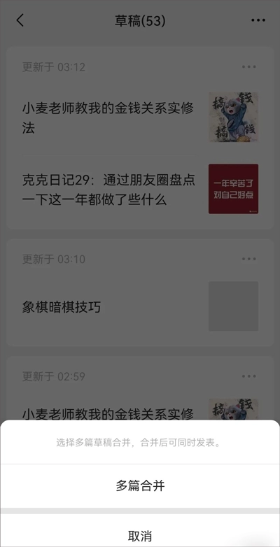 当你写完多篇文章后,先将它们全部存为草稿,再选择多篇进行合并。