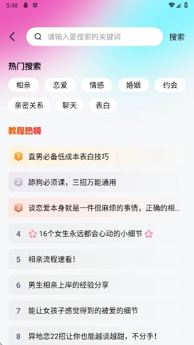 可借助搜索功能快速定位恋爱课程,方便迅速找到并即刻在线学习,从而提升恋爱能力。