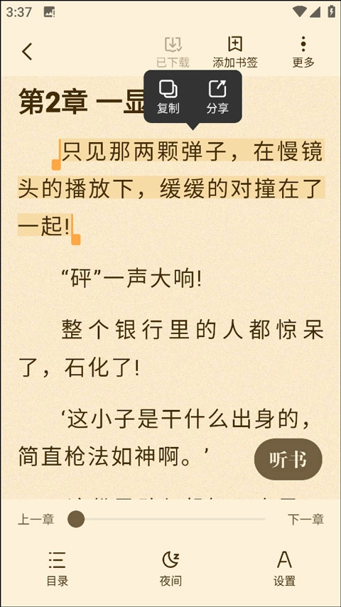 接着点击进入小说详情页面,选择“离线”选项,同样能够进入阅读界面。
