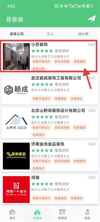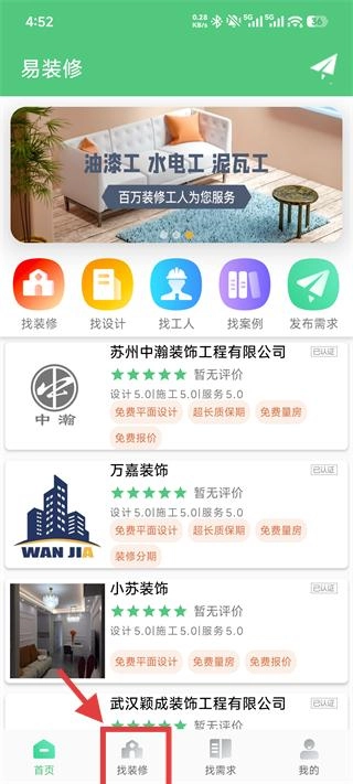 打开装修服务分类,点击底部的“找装修”选项,即可进入装修公司列表页面。