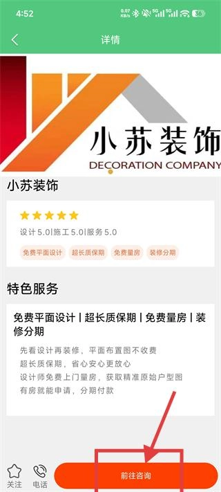 在装修公司的列表页面里,找到并点击“小苏装饰”这一项,就能进入该公司的详情页面了。