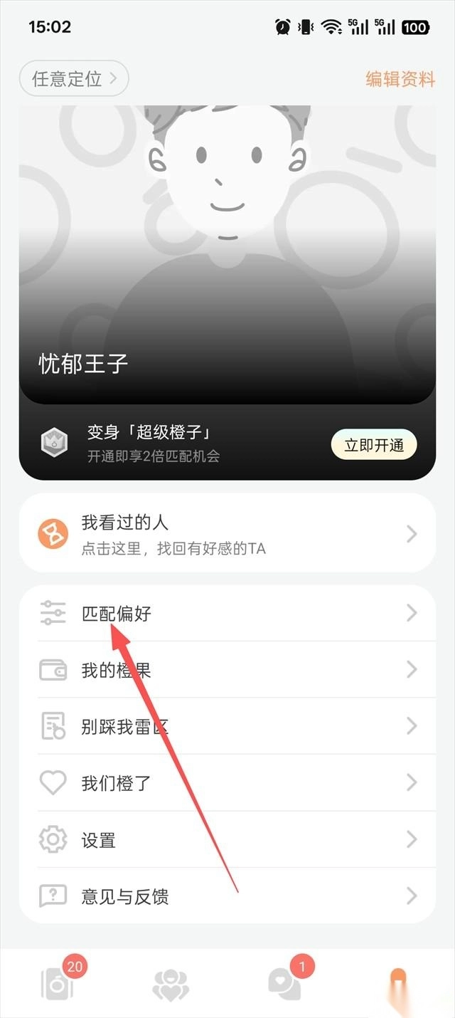 在橙App里,用户想要提高匹配到心仪对象的几率,可以去调整匹配偏好设置,具体操作是点击【我的】按钮。