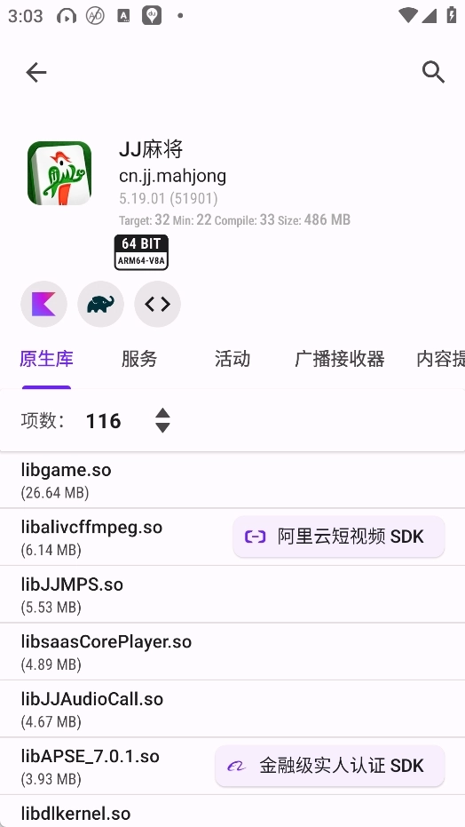 这款软件可查看应用所使用原生库的架构,涵盖无原生库、32位及64位支持等情况。借助饼状图,能直观统计原生库的架构分布,方便开展数据分析工作。此外,LibChecker还具备查看应用注册组件的功能,像服务、活动、广播接收器以及内容提供器等都能查看。用户通过它可以全面掌握每个应用的构成与依赖的库,进而为后续的测试和优化工作提供数据支撑。