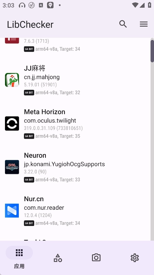 安装好LibChecker后打开应用,在首页就能看到手机上已安装的各类应用。