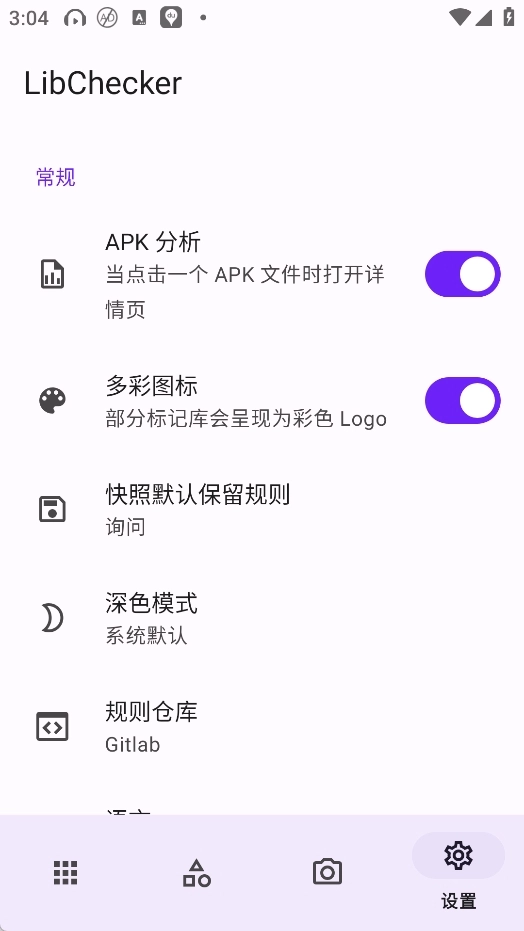LibChecker具备APK文件的相关处理与安装功能,用户完成安装并启动应用后,通过功能菜单栏能够便捷地进入应用列表、统计信息、快照管理以及设置选项等功能模块。应用列表会呈现出手机里已安装的全部游戏和软件,用户可以轻松选取任意一款应用来查看其详细信息。对比功能可对应用升级前后的组件差异展开分析,助力用户知晓更新所带来的具体变化。快照功能支持用户对应用状态进行管理与恢复,保障了测试和分析过程的灵活性。在设置界面中,用户还能够对背景颜色、APK分析选项以及云端规则等进行调整。
