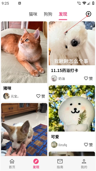 进入【发现】页面,可点击“+”可发布新动态。