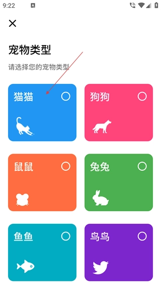 在宠物类型选择页面,点击对应的选项(比如【猫猫】),就能选定宠物类型。