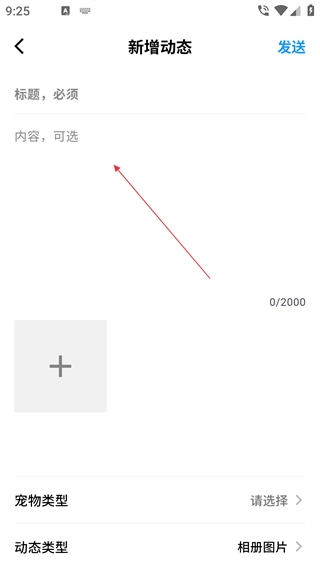 在新增动态页面,依次填写标题与内容、添加图片、选择宠物类型,最后点击【发送】按钮即可发布动态。