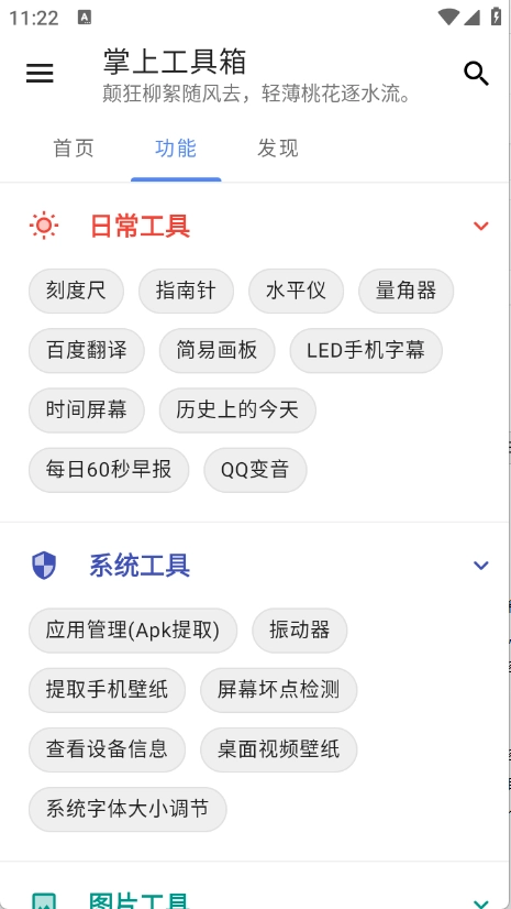 掌上工具箱里收纳了不少实用工具,日常、系统、图片等各类工具一应俱全,所有工具都能免费使用,直接打开就能上手,还能把常用工具收藏起来,方便随时找到需要的工具。
