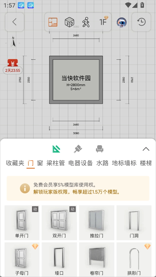 【手机端设计功能】:海量软硬装模型构件可自由布置,轻松实现家居室内设计、全屋定制、橱衣柜定制、别墅工装等各类设计需求。