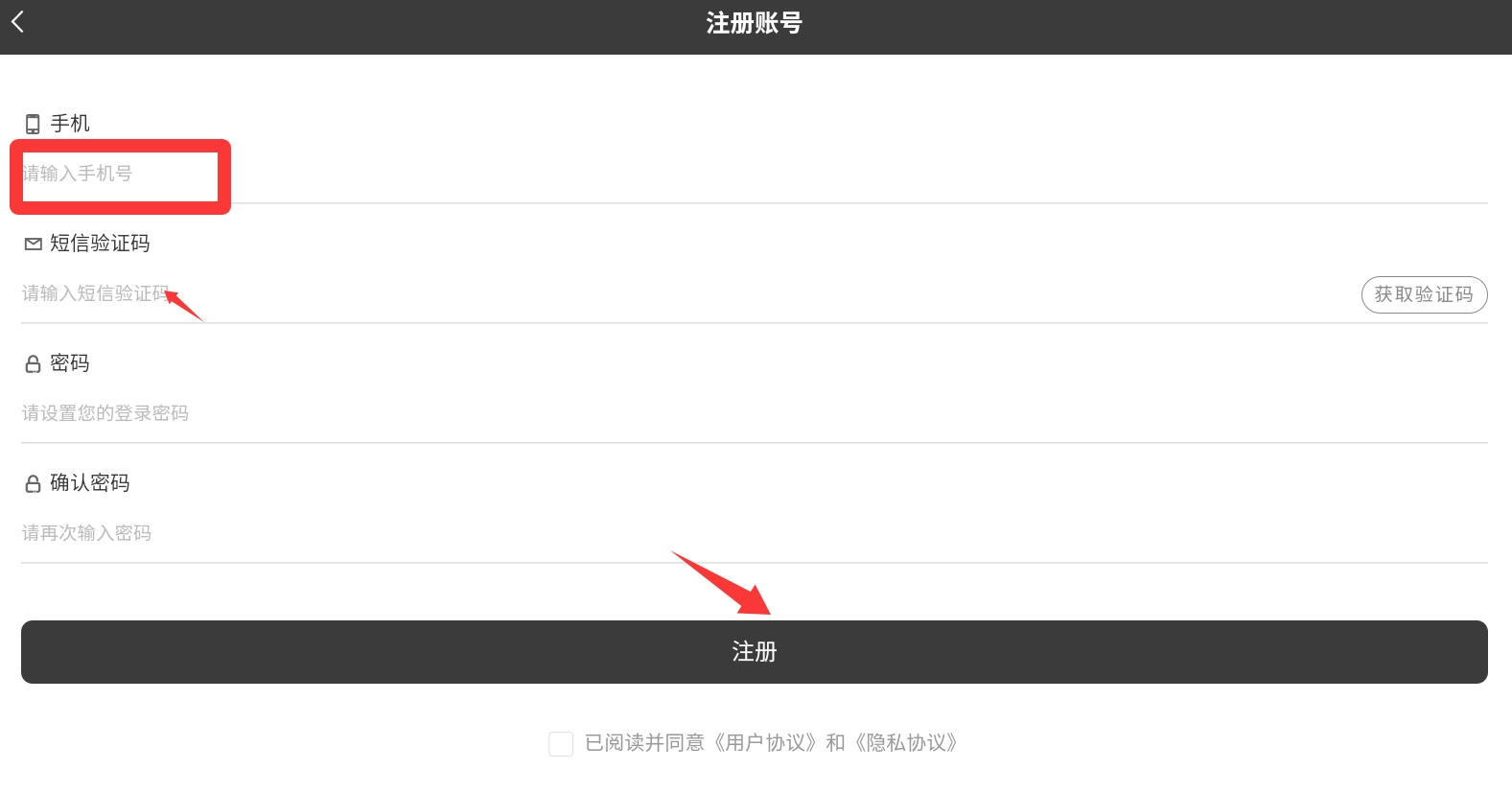 输入手机号码获取验证码填写密码然后注册。