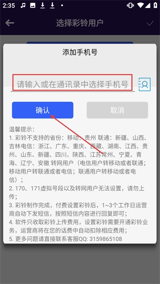 在【添加手机号】弹窗界面,您可以手动输入手机号,也能从通讯录里直接选择号码,最后点击【确认】按钮,即可完成手机号的设置操作。