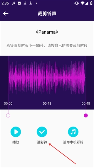 进入“裁剪铃声”界面后,根据自己的需求对《Panama》这首铃声进行裁剪操作,完成后点击“设彩铃”按钮。