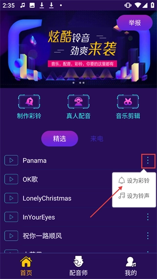 在彩铃应用的首页,先找到你想要设置的目标彩铃(比如《Panama》),接着点击该彩铃右侧的三点图标,然后选择“设为彩铃”选项即可。