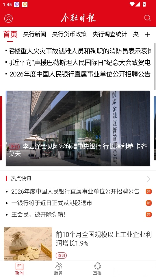 金融时报是一款聚焦金融财经新闻的应用,它把金融财经类的新闻资讯划分成了多个频道类别,像央行新闻、央行货币政策、央行调查统计、金融管理、证券、保险、互联网金融等都包含在内,覆盖了财经新闻的全领域类型,能让用户在这里随时获取更多最新的财经新闻。随时关注财经新闻,有助于用户在金融领域及时把握先机,了解金融行业具有前瞻性的资讯信息。此外,应用还推出了不少直播新闻,用户可以通过观看直播了解实时播报的新闻内容,让获取各类新闻资讯更及时便捷。有需要的用户,快来使用金融时报免费版吧!