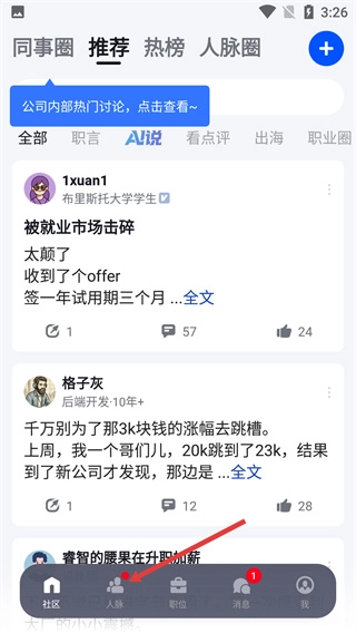 进入社区页面后,点击底部的【人脉】选项,即可进入人脉相关操作界面。