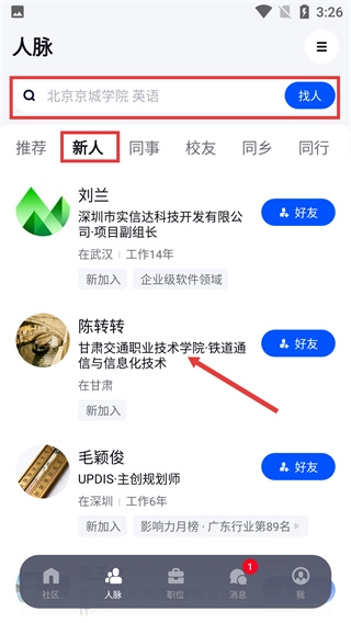 进入【人脉】页面后,你可以在搜索框中输入相关信息,然后切换至【新人】标签页,找到对应的人脉条目并进行后续操作。