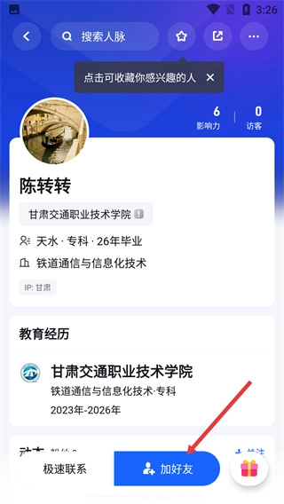 进入目标人脉的详情页面,查看对方的教育经历等相关信息后,点击页面上的【加好友】按钮,即可发起好友申请。