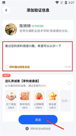 进入【添加验证信息】页面后,先确认系统默认的留言内容,接着可以根据需要选择相关选项,最后点击【发送】按钮来提交好友申请。