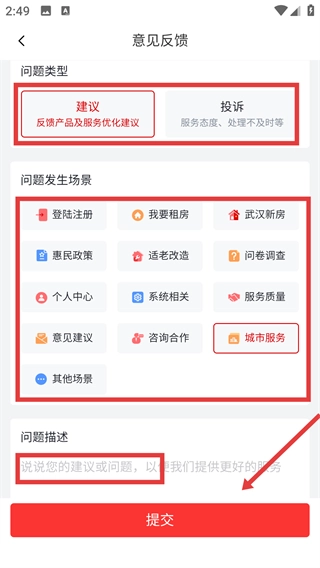 在意见反馈页面,先选定问题类型与发生场景,接着详细描述问题,最后点击【提交】按钮,即可完成客服反馈流程。