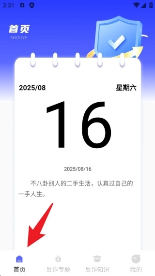 打开App后会自动进入「首页」界面,在这里可以看到当天的日期以及提醒语录,有助于培养每天关注安全的习惯。