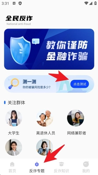 点击底部导航栏的「反诈专题」,进入功能入口页面后,不同群体的用户都能看到专属的防范内容推荐。