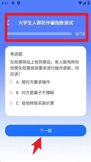 在「反诈专题」页面点击“点击测试”按钮,就能进入风险测试系统,初步评估自己的反诈防范能力。