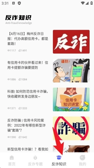 切换至底部的「反诈知识」页面,就能浏览各类图文防范文章,了解近期热点案例及对应的应对方法。