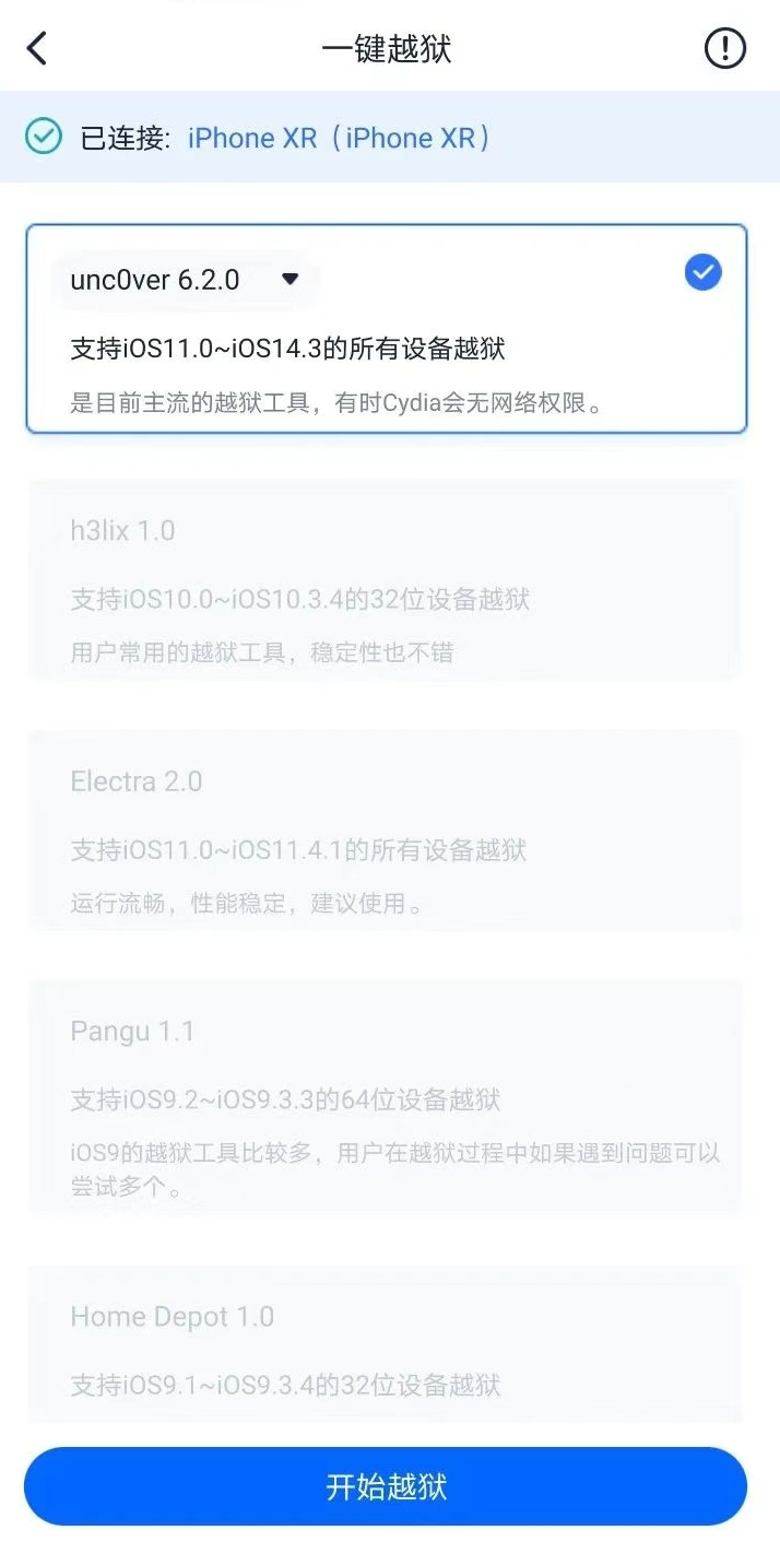 连接成功后,进入“一键越狱”功能页面,系统会自动匹配当前设备所支持的越狱工具。