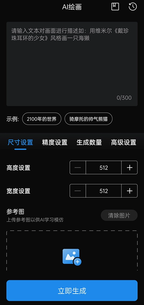 可以在文本描述框中填写相关内容,像“2100年的世界”这类主题都可以;此外还能对尺寸等参数进行设置。等所有设置都完成后,再添加图片就可以了。