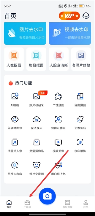打开软件后,点击底部的【工具箱】按钮,就能进入工具分类页面啦。