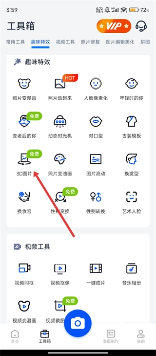 在工具箱的【趣味特效】分类里,找到【3D图片】功能,点击该功能就能进入图片编辑环节啦。