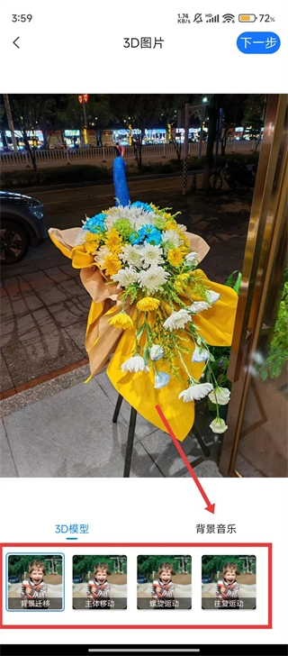 在完成背景音乐的设置后,点击右上角的【下一步】按钮,即可生成并保存制作完成的3D图片。