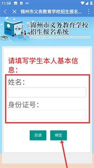 在信息填写页面,输入学生的姓名、身份证号等基本信息后,点击“绑定”按钮,即可完成学生信息的绑定操作,从而推进招生报名流程。